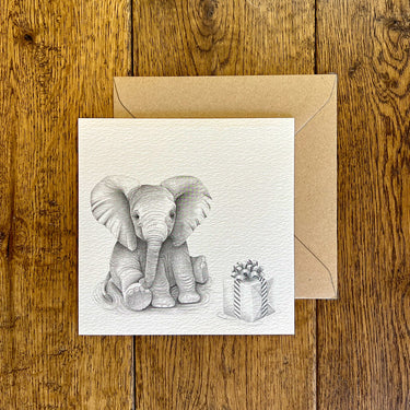 Elsie Elephant With Present Pencil Illustrated Greeting Card