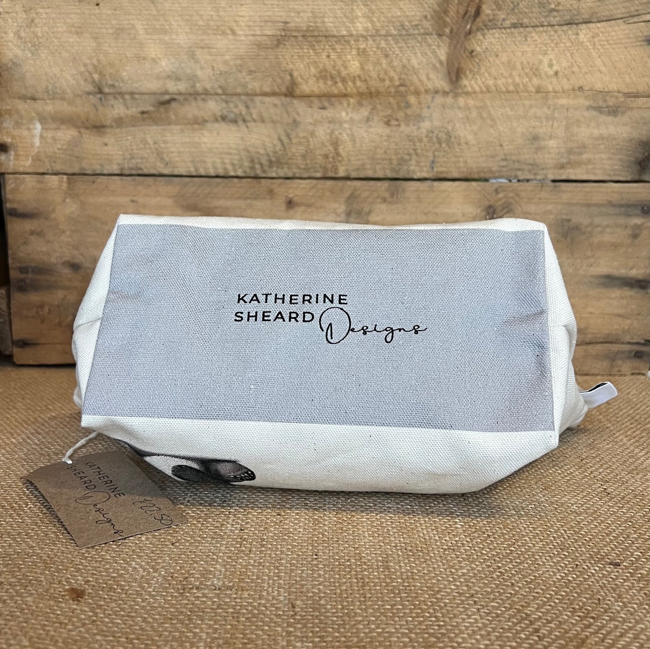 Premium lined wash bag. 100% unbleached cotton exterior printed with hand drawn designs on both sides